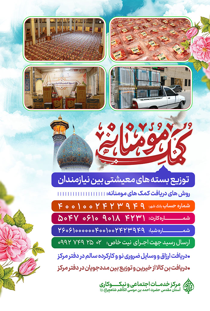 همزمان با شب یلدا، مرکز خدمات اجتماعی و نیکوکاری حرم مطهر حضرت احمدبن موسی الکاظم علیهماالسلام، با مشارکت کمک‌های مردمی و همراهی خادمان این آستان مقدس، اقدام به تهیه و توزیع ۲۰۰ بسته‌ معیشتی به ارزش ۶ میلیارد و ۳۰۰ میلیون ريال میان نیازمندان و مددجویان تحت پوشش در قالب طرح کمک‌های مومنانه کرد.  به گزارش روابط عمومی و امور بین الملل آستان مقدس، این بسته‌