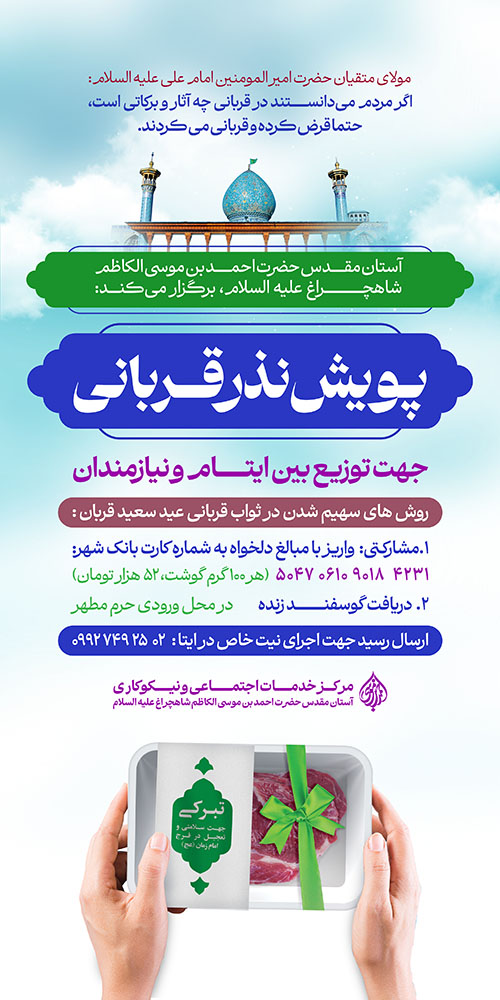 مرکز خدمات اجتماعی حرم مطهر با بهرهگیری از مشارکت خیرین و نذورات مردمی، تلاش دارد با اجرای مستمر برنامههای حمایتی در مناسبتهای مختلف مذهبی و ملی، نقش مؤثری در کاهش مشکلات معیشتی اقشار آسیبپذیر ایفا کند. نیکاندیشان گرانقدر که تمایل به مشارکت در فعالیتهای خیّرانه حرم مطهر دارند، میتوانند هدایای نقدی خود را به شماره کارت ۵۰۴۷۰۶۱۰۹۰۱۸۴۲۳۱ یا شماره شِبا ۲۶۰۶۱۰۰۰۰۰۰۴۰۰۱۰۰۲۴۲۳۹۴۹ واریز و رسید خود را جهت اجرای نیّات مختلف، به شماره ۰۹۹۲۷۴۹۲۵۰۲ در پیام رسان ایتا ارسال نمایند. همچنین خیّرین ارجمند می توانند در ساعات اداری به دفتر این مرکز، واقع در صحن احمدی، مراجعه و یا جهت کسب اطلاعات بیشتر با شماره تلفن ۳۲۱۳۱۴۱۸ تماس حاصل فرمایند.